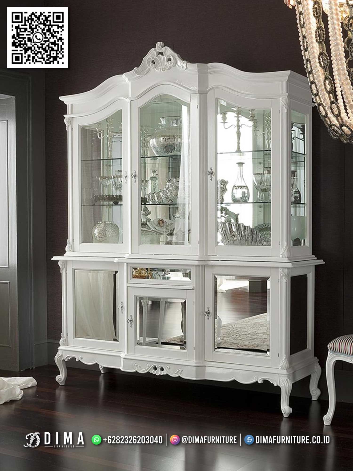 Lemari pajangan mewah jepara duco ivory aurelia dengan desain elegan dan ukiran halus. Cocok untuk ruang makan atau ruang tamu agar tampil rapi dan berkelas.