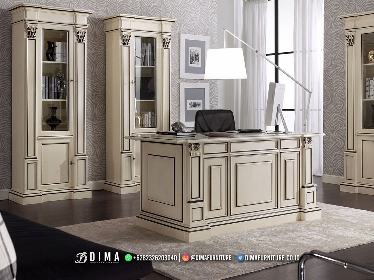 Model ini dibuat dari material kayu solid pilihan yang kokoh dan stabil untuk pemakaian jangka panjang. Detail panel serta garis tegas pada setiap sisi memberi kesan furniture kantor mewah tanpa terlihat berlebihan. Finishing ivory berpadu aksen klasik menjadikan tampilannya lebih bersih dan mudah dipadukan dengan berbagai konsep interior, baik klasik modern maupun semi klasik.