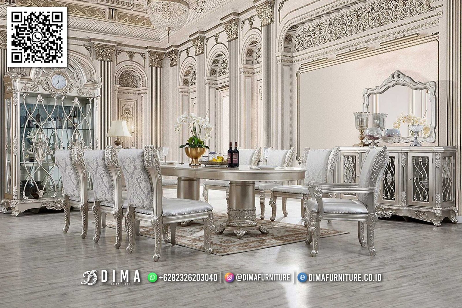 Meja makan klasik mewah silver jepara menghadirkan keanggunan abadi dengan sentuhan ukiran halus dan warna silver elegan yang memikat.