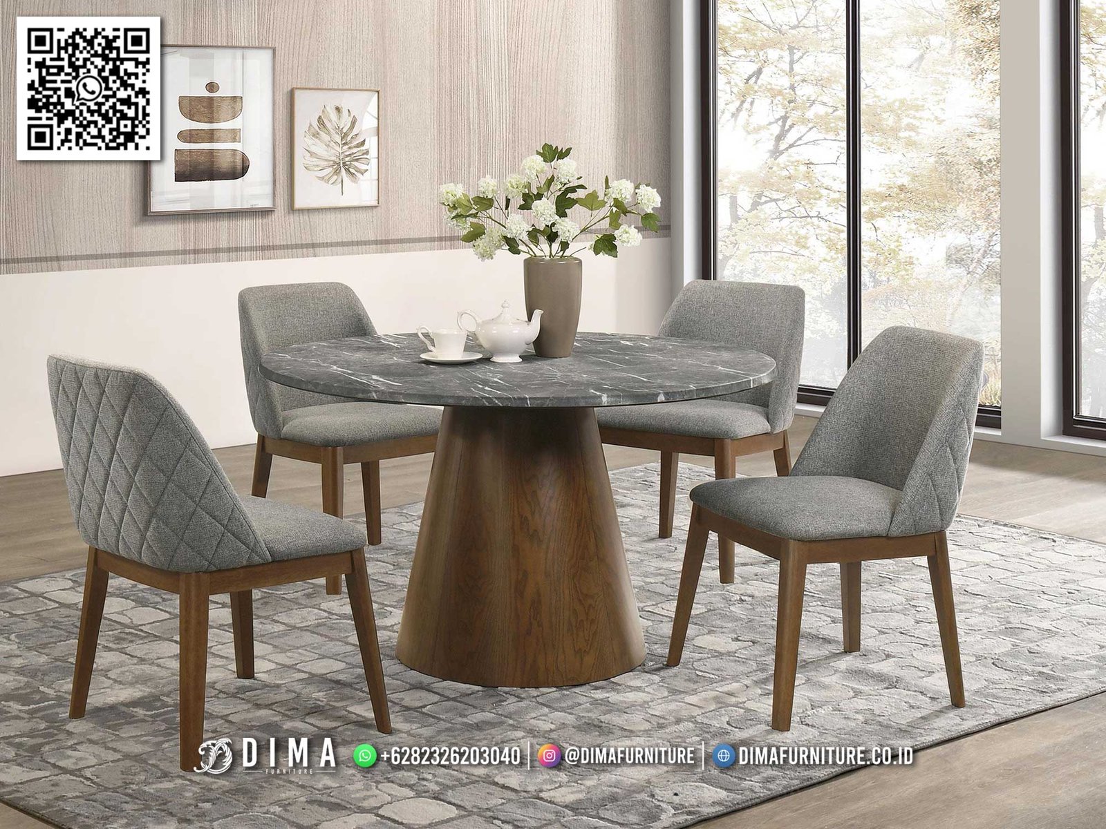 Meja makan marble grayston hadir dengan desain yang terasa modern namun tetap nyaman untuk digunakan sehari-hari. Tampilan top table bermotif marble memberikan kesan elegan tanpa terasa berlebihan, cocok untuk ruang makan minimalis maupun interior bergaya kontemporer. Kombinasi antara meja berbentuk bundar dan kursi dengan detail quilting membuat set ini terlihat rapi dan serasi.