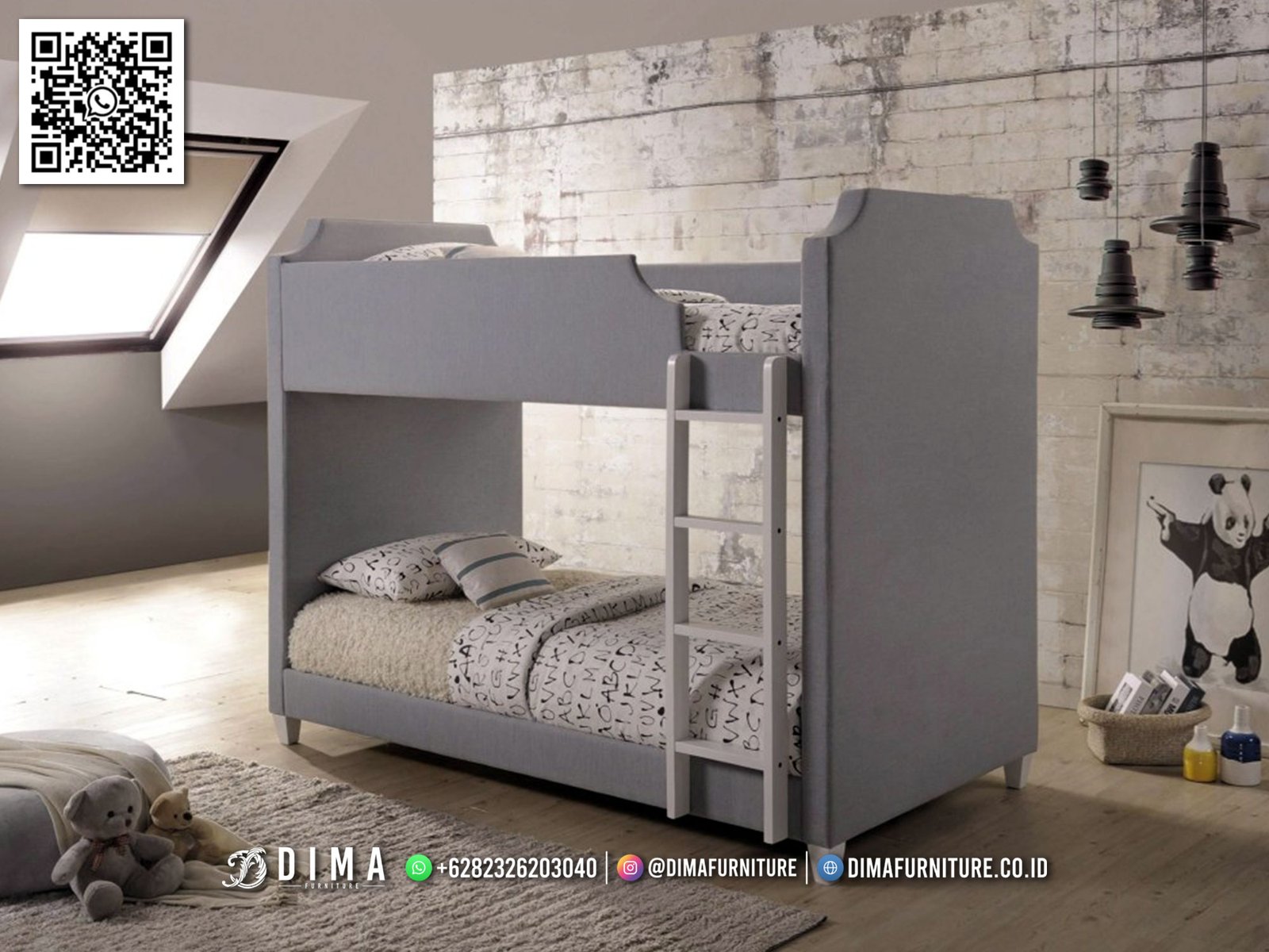 Tempat tidur tingkat anak minimalis bianca series dengan desain modern dan warna grey netral. Solusi hemat ruang untuk kamar anak yang tetap rapi dan nyaman.
